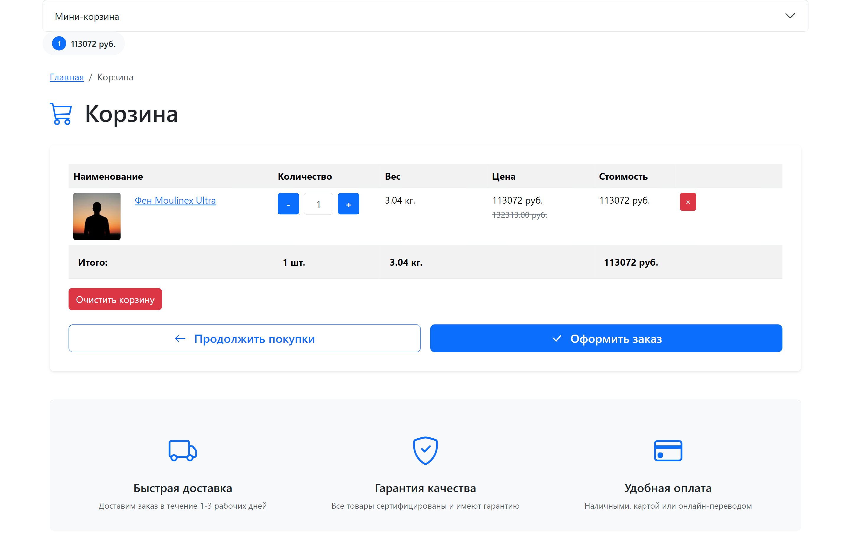 - Блок преимуществ — информация о доставке, гарантии и оплате
