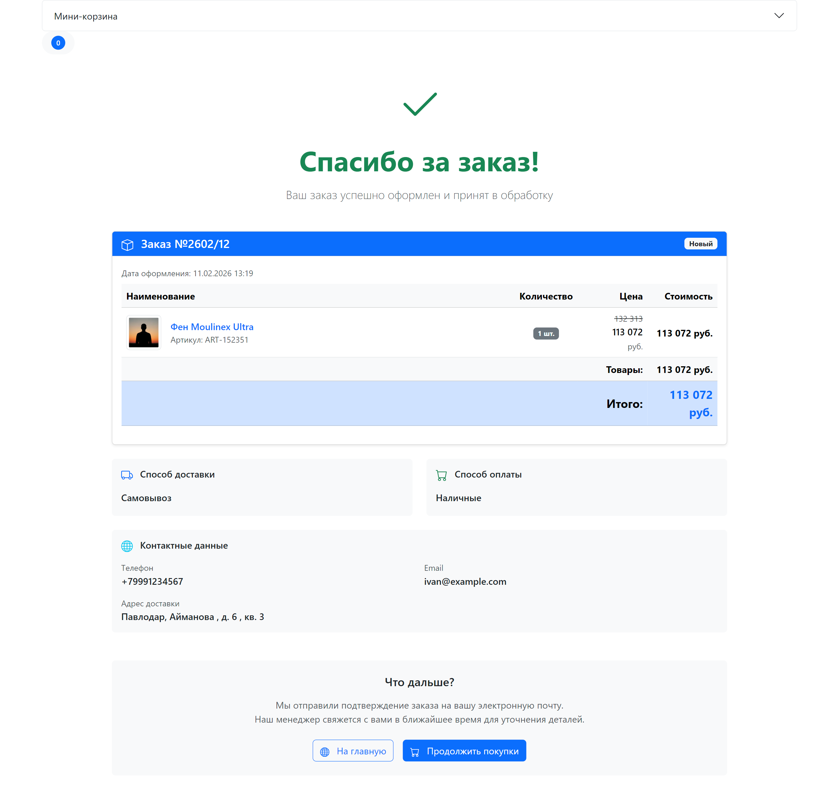 Страница благодарности отображается после успешного оформления заказа. Показывает детали заказа и дальнейшие действия для покупателя.